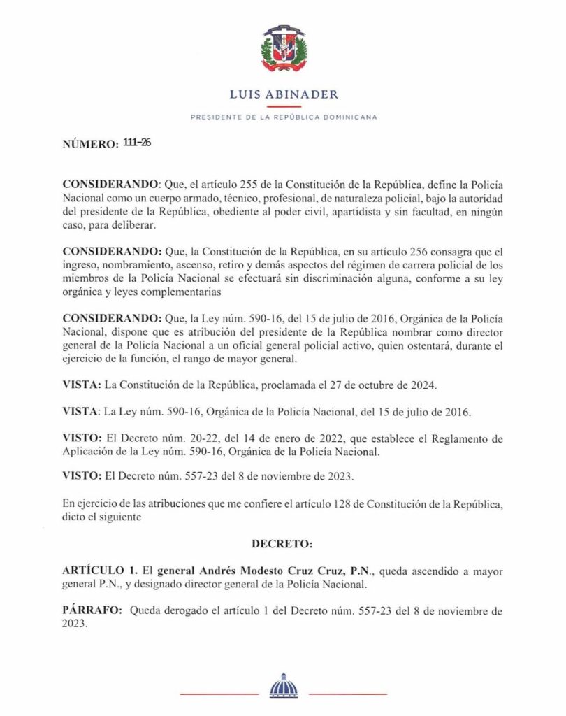 El presidente de la República, Luis Abinader, dispuso el ascenso del general Andrés Modesto Cruz Cruz, P.N., al rango de mayor general y su designación como nuevo director general de la Policía Nacional, mediante el Decreto núm. 111-26.