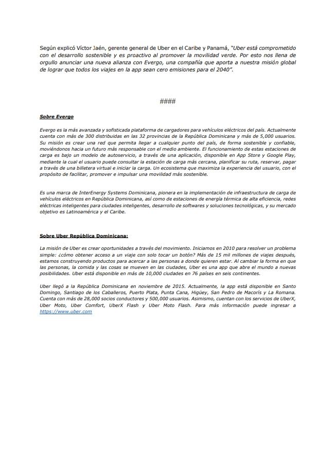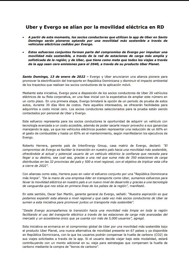 Evergo y Uber anunciaron una alianza pionera para promover la electrificación del transporte en República Dominicana y disminuir el impacto ambiental de los trayectos que realizan los socios conductores de la aplicación móvil.